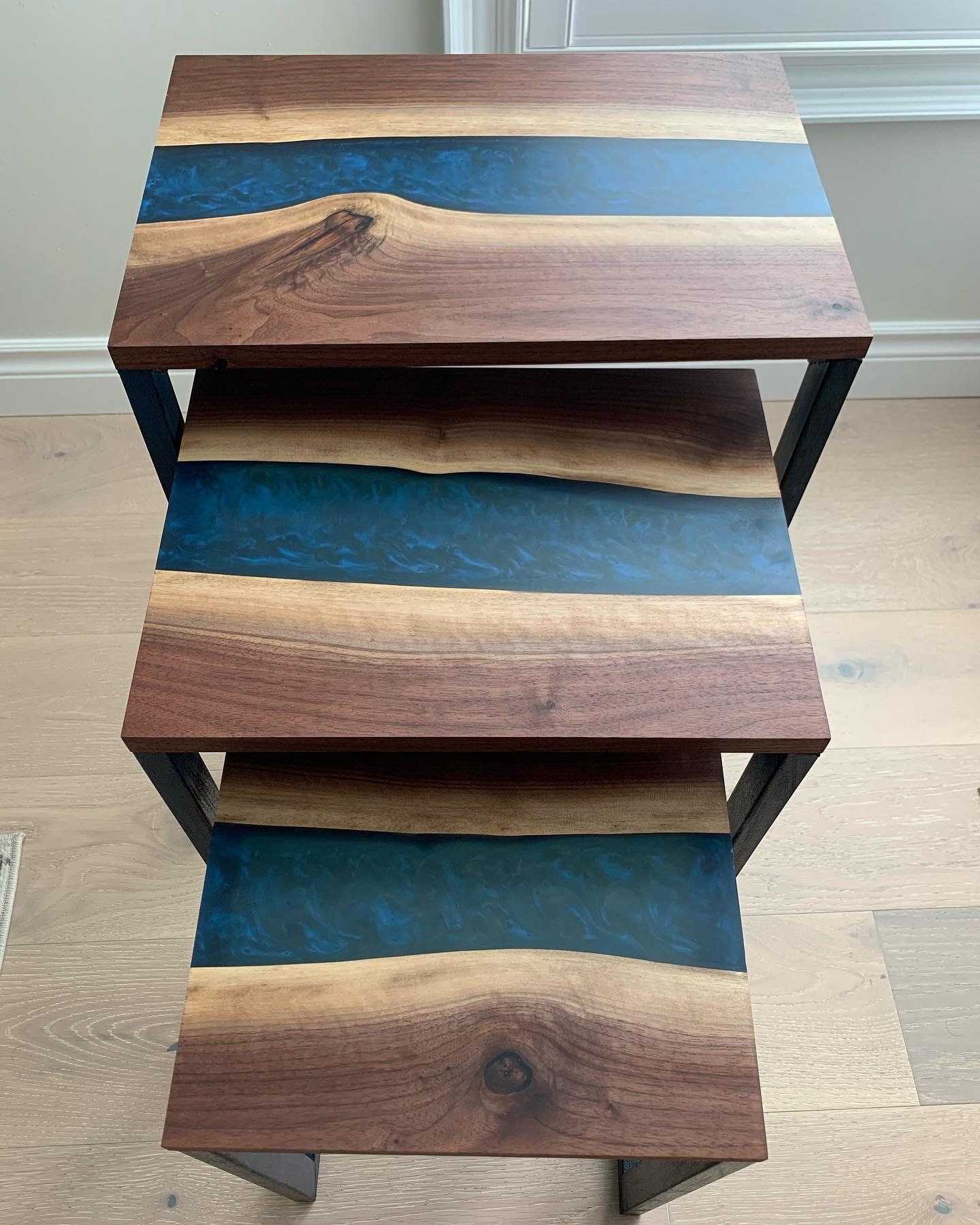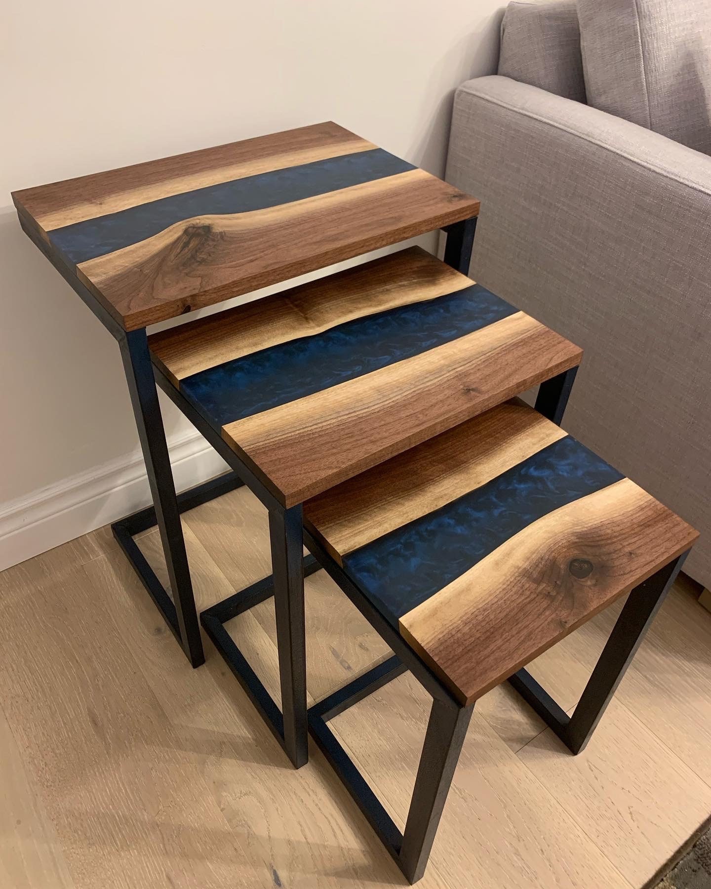 | Tags | This epoxy nesting table is a set of three tables of different sizes that can be conveniently stacked together for compact storage or used individually for various purposes. Typically, the smallest table fits snugly beneath the medium-sized one, which, in |