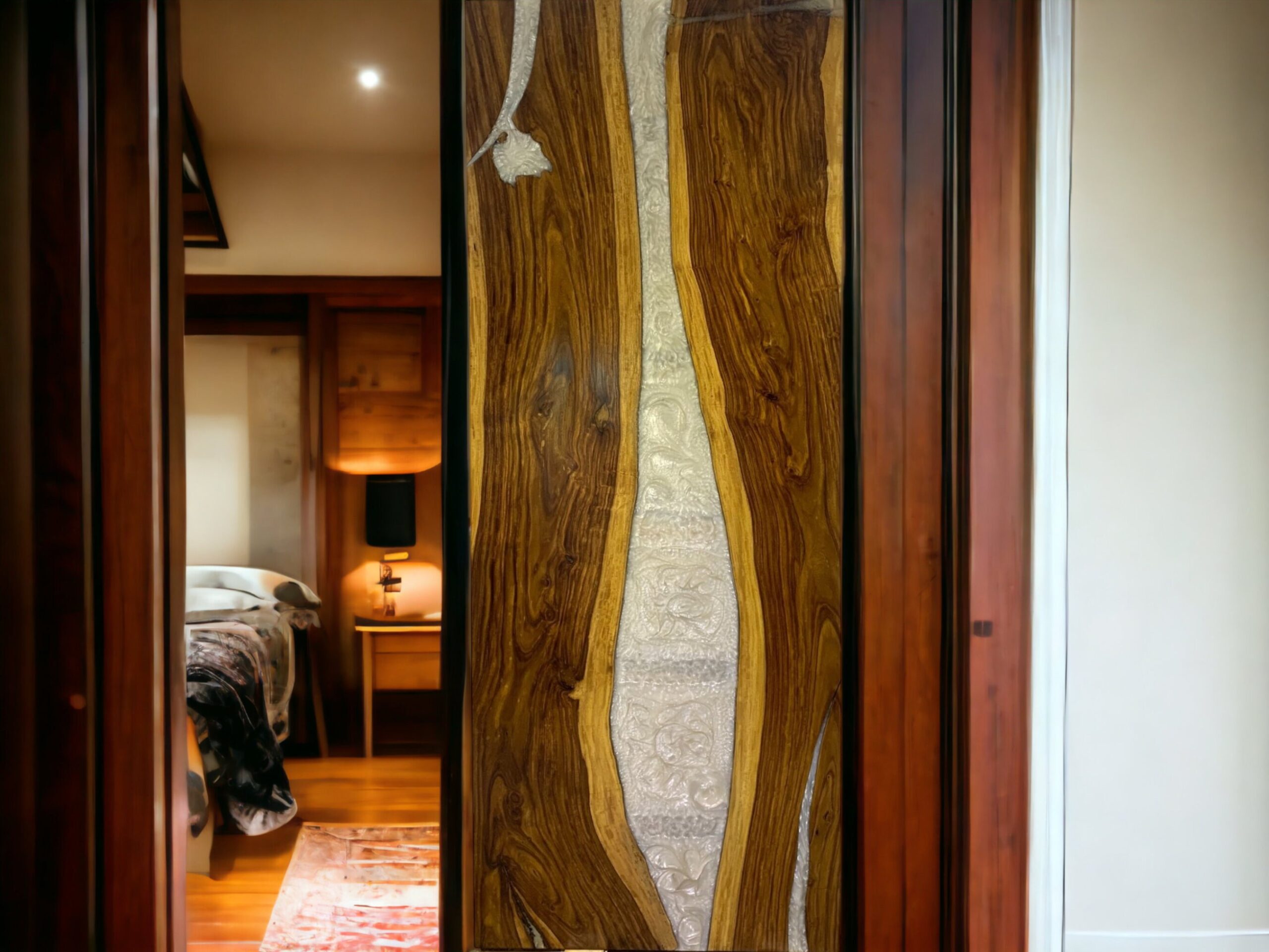 Each resin barn door features a captivating resin design embedded within a robust wood frame. This technique creates a beautiful visual effect, making your door a standout feature. Handcrafted by skilled artisans, every door is a unique masterpiece, reflecting both the natural beauty of the wood and the creativity of the resin patterns.